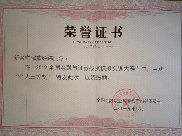 2019年4月下旬以英国上市公司365蒋鹏老师为领队的大赛指导老师团队通过证券投资理论知识笔试考核方式举行校赛选拔赛,从中遴选出大赛参赛选手。参加初赛的4支队伍由三名指导老师分别指导。比赛阶段,老师们组织员工观看了国泰安云课堂的大赛赛制解读与操作培训,基本面分析与操盘培训,根据比赛情况,随时给员工进行操作技能的提升培训。经过紧张激烈的比拼,最终蒙经纬同学荣获大赛个人三等奖。