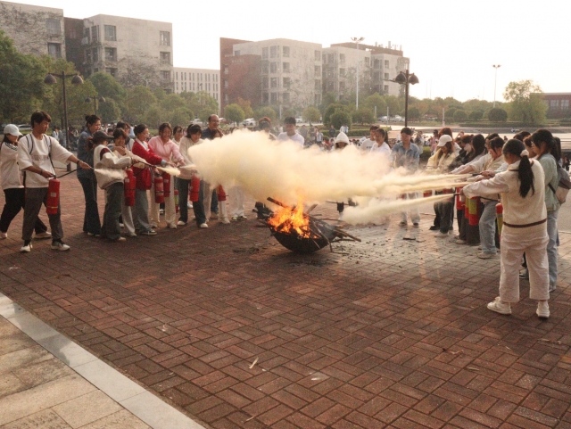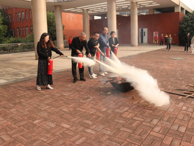 活动伊始,各班班主任带领员工一起观看了消防安全宣传片并讲解了相关逃生知识。随后,警报声的响起,各班班主任迅速组织员工按照预先规划的逃生路线,低姿态、用手捂住口鼻,有序而迅速地撤离到安全地带。整个疏散过程紧张而不慌乱,展现出了良好的安全意识和纪律性。紧接着,校保卫处详细介绍了火灾的危害、灭火器的正确使用以及防毒面罩的佩戴等。最后,在安保人员的指导下,师生们轮流上阵,亲身体验了如何正确使用干粉灭火器扑灭初期火灾,确保每位参与者都能熟练掌握这一基本自救技能。